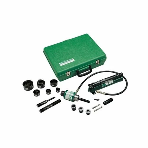 Knockout kit with driver; hand pump and Slug-Buster punches; dies; draw studs for 1/2 -2″. Adapter; spacers; Kwik Stepper step bit in plastic case. Can be used with most standard round Slug-Buster and Slug-Splitter SC punches (except 1/2″; 9/16″ or 5/8″) Can be used with non-round punches; adapter may be required.